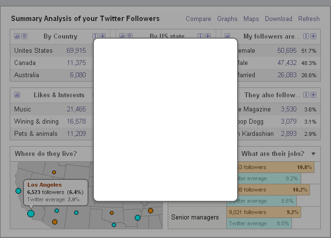 Get maps, stats, graphs and more, free when you send a tweet. We need to connect with Twitter to analyze your followers and post your tweet... On the next screen, click the blue "Authorize app" button. Get an instant snapshot profile of your followers, with no need to tweet or authorize our app...
